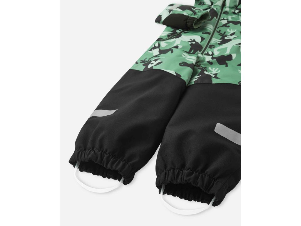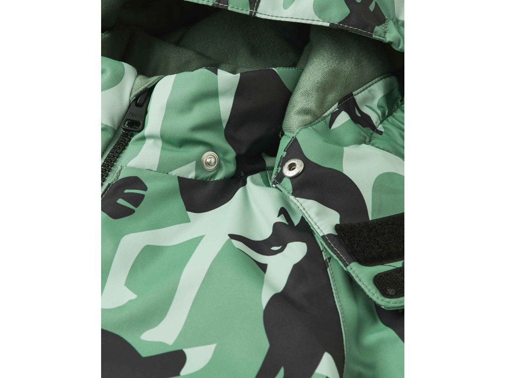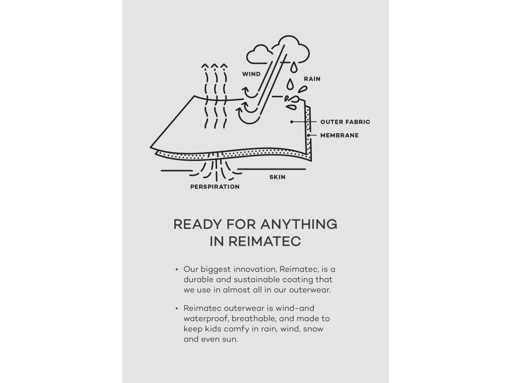 Dětská membránová zimní kombinéza Reimatec Kurikka je ušita z nepromokavého a zároveň prodyšného materiálu s povrchovou úpravou Bionic-Finish Eco. V zadní části kombinézy a na nohavicích od kolen dolů je použit materiál s vyšší pevností a odolností. Všechny švy jsou vodotěsné. Kombinéza má bezpečnou snadno odnímatelnou kapuci a vyšší stojací límec. Na předním dílu se po celé délce zapíná na zip s chráničem brady. Má dvě kapsy na zip. Vzadu v pase je stažena gumou a rukávy i nohavice má zakončené pružnými lemy. K nohavicím lze připevnit silikonová poutka pod boty. Na kombinéze je celoplošný potisk a výrazné reflexní detaily.